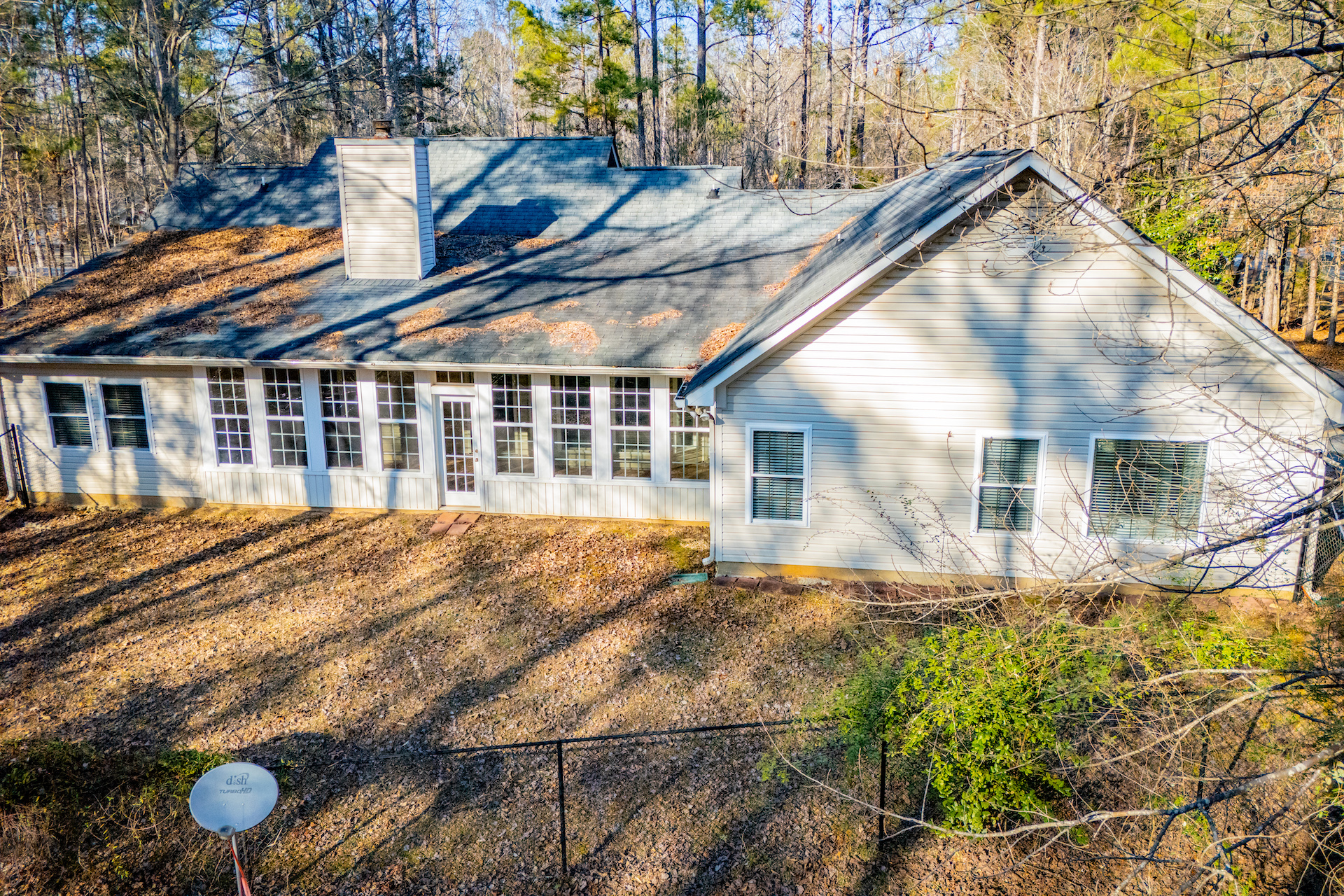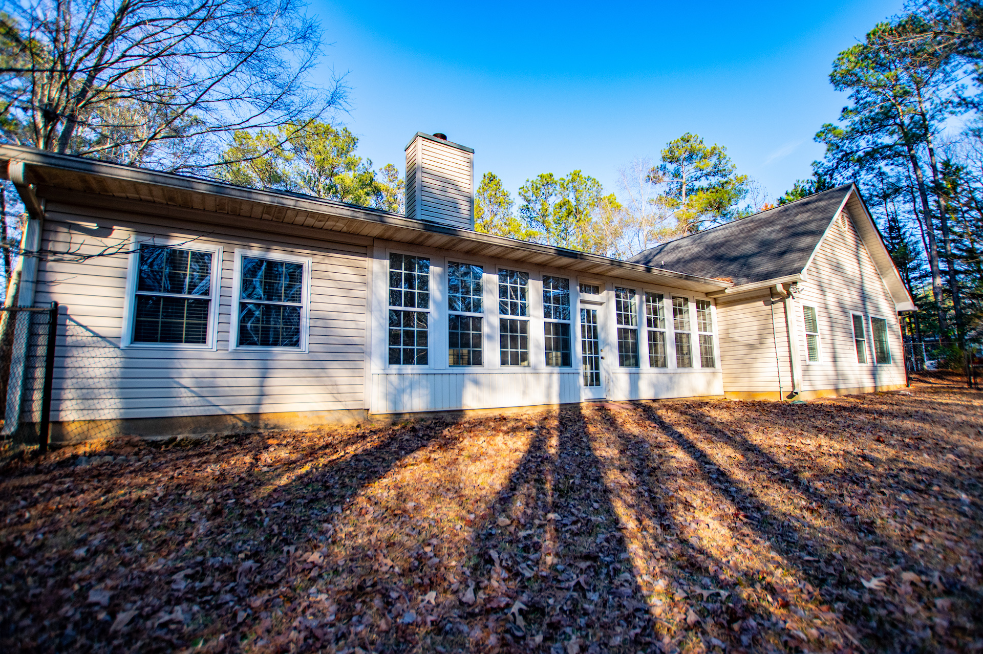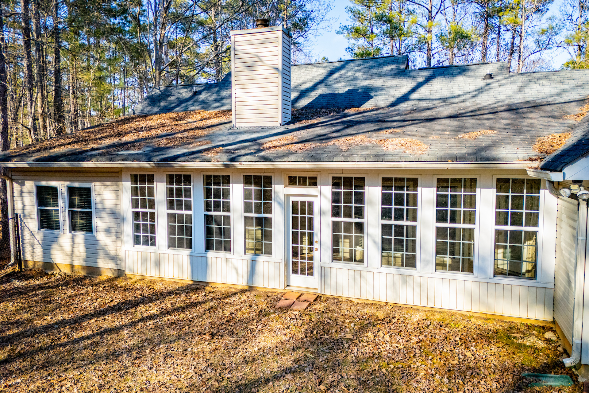 The kitchen provides generous wood cabinetry, ample counter space, and an easy flow into the dining/breakfast area with bright bay windows. One of the standout features is the enclosed sunroom, giving you extra flex space for relaxing, a home office, or a playroom—while still enjoying the wooded setting.