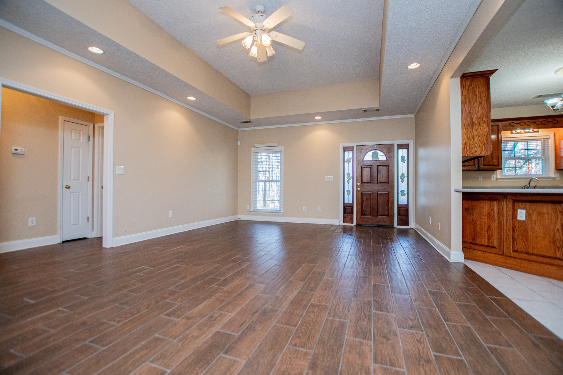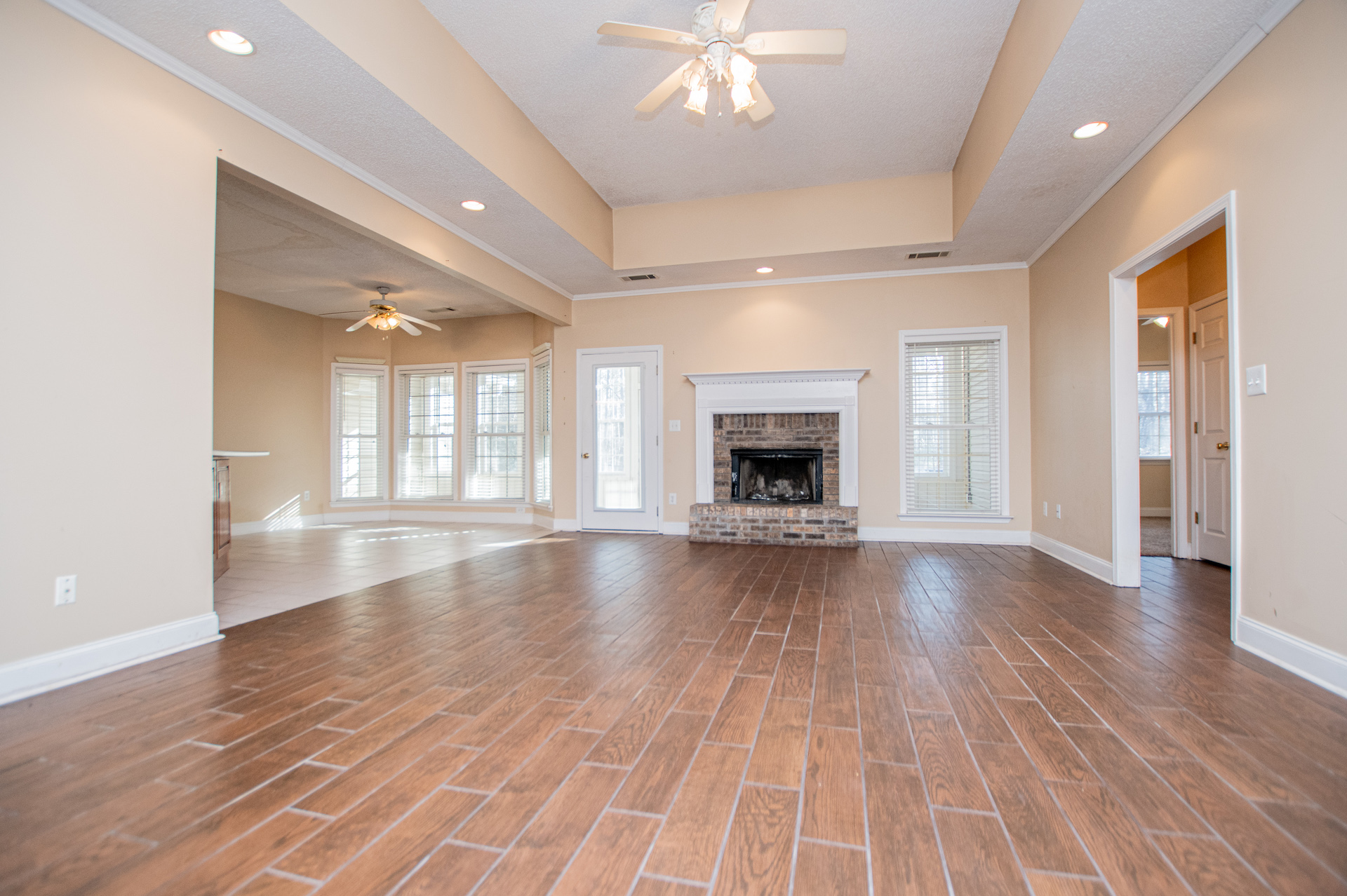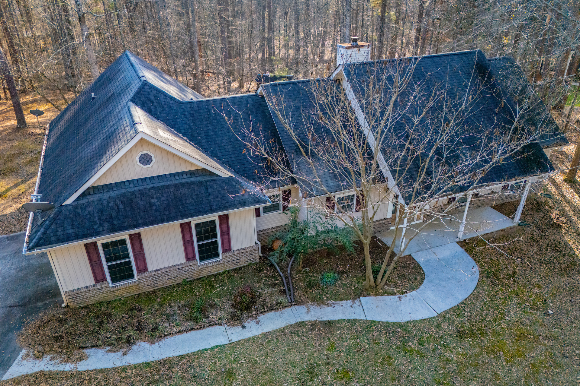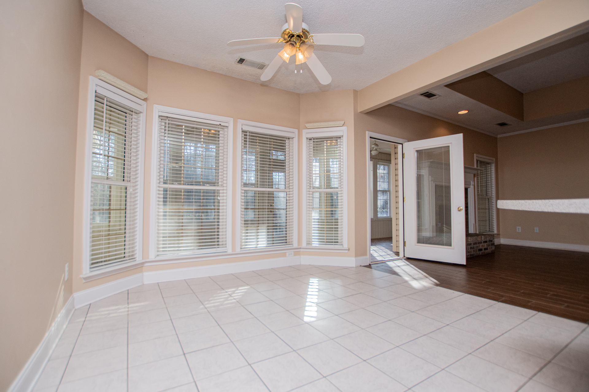 The kitchen provides generous wood cabinetry, ample counter space, and an easy flow into the dining/breakfast area with bright bay windows. One of the standout features is the enclosed sunroom, giving you extra flex space for relaxing, a home office, or a playroom—while still enjoying the wooded setting.